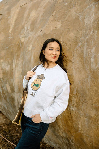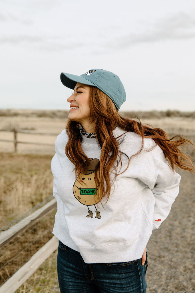 Artwork by my daughter!  We love the little Idaho Potato Guy. Constructed with heavyweight cotton rich fabrics, this fleece is durable and soft. The women’s boxy crewneck sweatshirt offers a silhouette that is both stylish and cozy. Featuring an interior brushed finish for added comfort, dropped shoulders, oversized fit, and a wide ribbed waistband sure to become a new favorite.